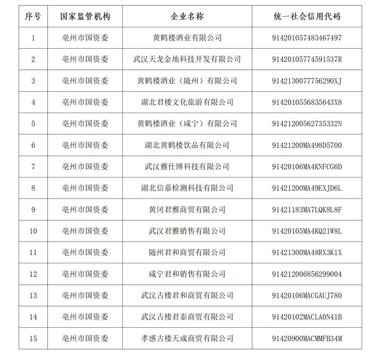 依據相關要求,現將黃鶴樓酒業(yè)有限公司出資企業(yè)名單進行公示,如有變化,將及時更新。企業(yè)信息如下: