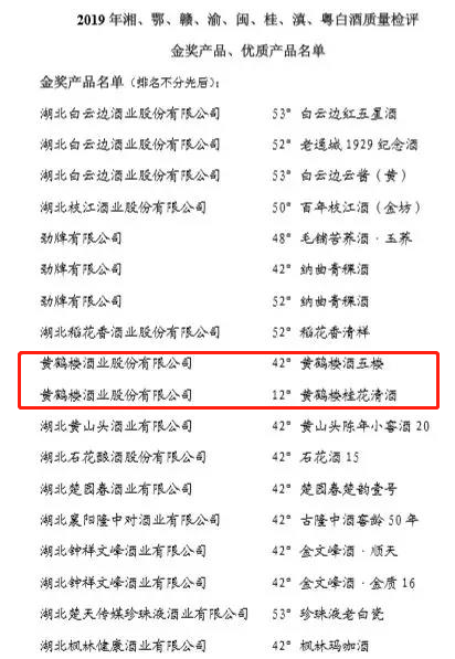 近日,在第十一屆酒類質(zhì)量檢評(píng)會(huì)上,黃鶴樓酒業(yè)“42%vol黃鶴樓五樓”榮獲“2019年湘鄂贛渝閩桂滇粵白酒質(zhì)量檢評(píng)信得過金樽獎(jiǎng)”稱號(hào),“12%vol黃鶴樓桂花清酒”榮獲“2019年湘鄂贛渝閩桂滇粵白酒質(zhì)量檢評(píng)金獎(jiǎng)”稱號(hào)。